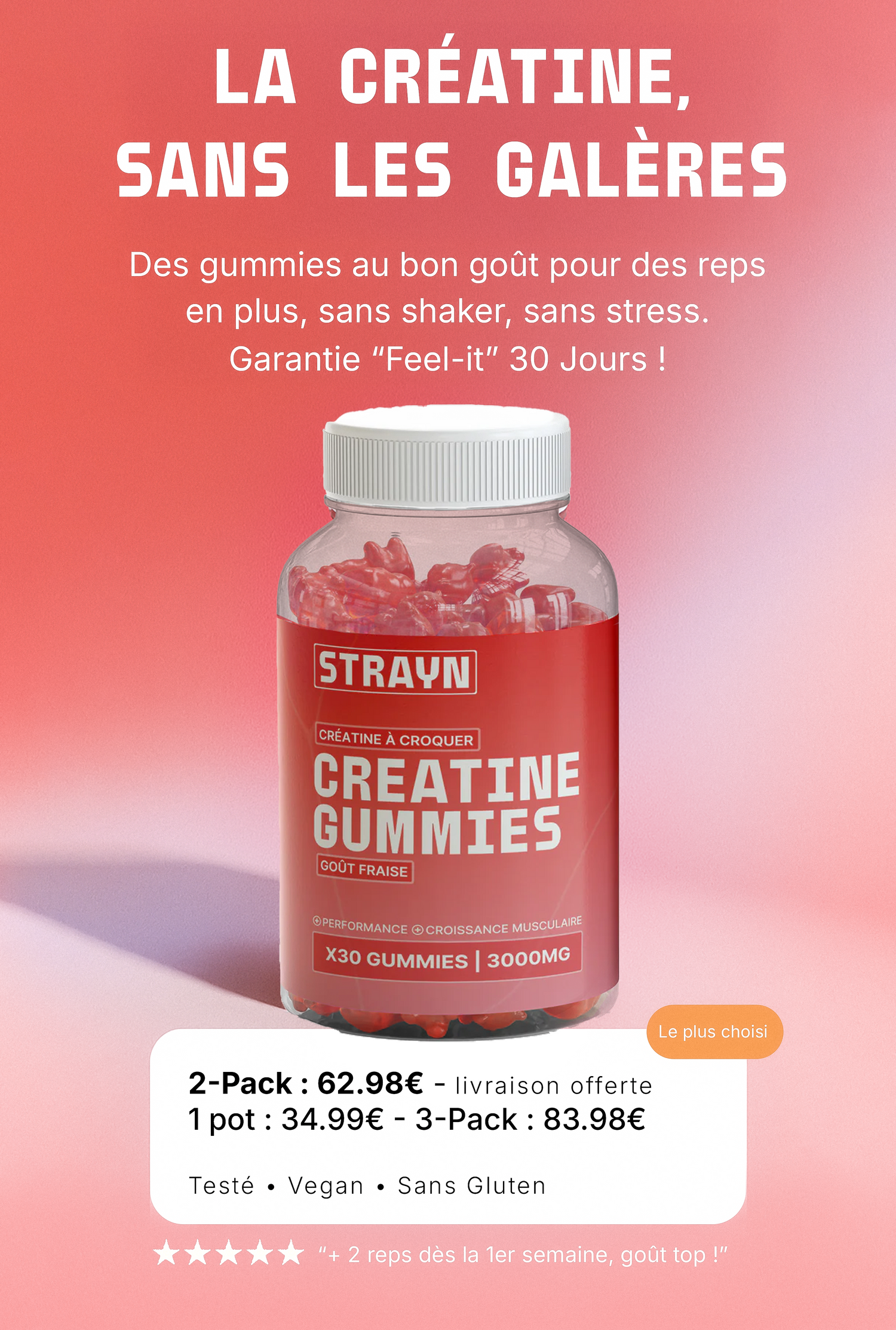 Compactes et nomades, nos gummies créatine se glissent dans ton sac pour t’accompagner à chaque séance — de la salle au parc, sans jamais faiblir.